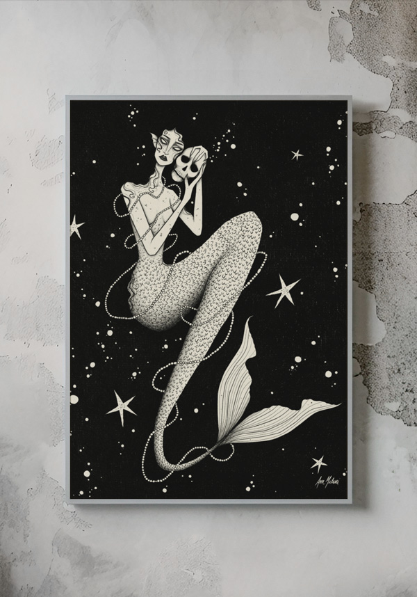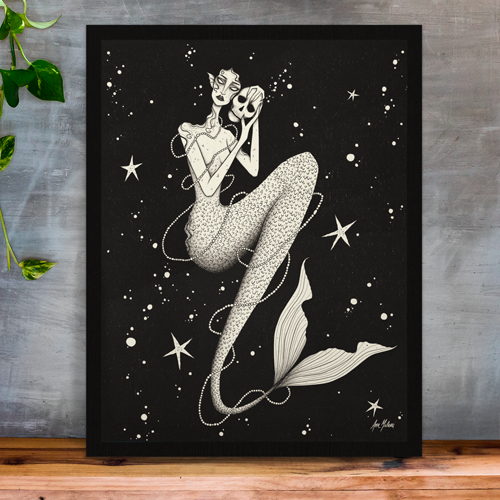 Esta ilustração digital fala de finitude. Uma sereia — cujo cabelo se desprende do corpo e segue desfazendo-se em ondas, em tinta e escuridão até que não haja mais diferença entre ela e o abismo que a contém — é a ausência que engole tudo. Suas mãos carregam um crânio, uma relíquia. A memória petrificada de alguém que ela amou e devorou com a mesma boca, com toda a fome que a solidão do mar ensina. E quando a pessoa amada se vai, dissolvida e consumida, o que sobra é apenas o osso frio, a forma sem substância. As estrelas ao redor testemunham indiferentes, como o tempo sempre é.