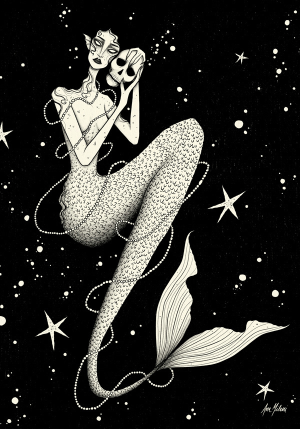 “Sua obra é um mergulho profundo na finitude. Ana ilustrou uma sereia cujo cabelo se desprende do corpo, desfazendo-se em ondas e escuridão até não haver mais diferença entre ela e o abismo que a contém. Em suas mãos, a criatura carrega um crânio, a memória petrificada de alguém que ela amou e devorou com toda a fome que a solidão do mar ensina.”