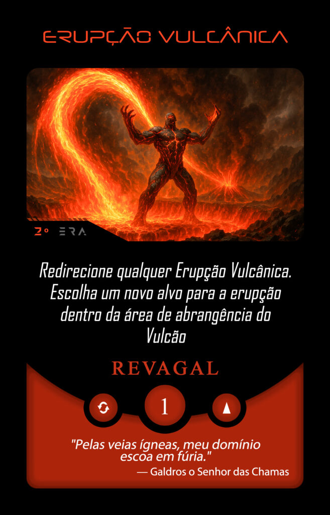 Nos territórios que circundam o Vulcão pulsa o coração ardente do Planeta Insano. Ali reina Galdros, o Senhor do Fluxo, força primordial da forja e da transformação. Rios de magma serpenteiam pela terra como veias incandescentes, moldando montanhas, consumindo antigas formas e dando origem ao novo. Galdros guarda o Altar de Revagal, onde matéria e energia se entrelaçam. Sua presença lembra que criação e destruição são faces do mesmo movimento. Quando o equilíbrio se rompe, ele não hesita. No Grande Expurgo, o continente pode ser coberto por fogo líquido, reiniciando ciclos sob cinzas férteis.