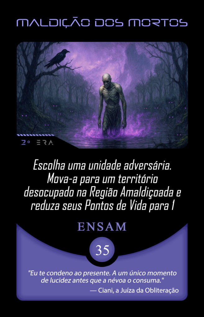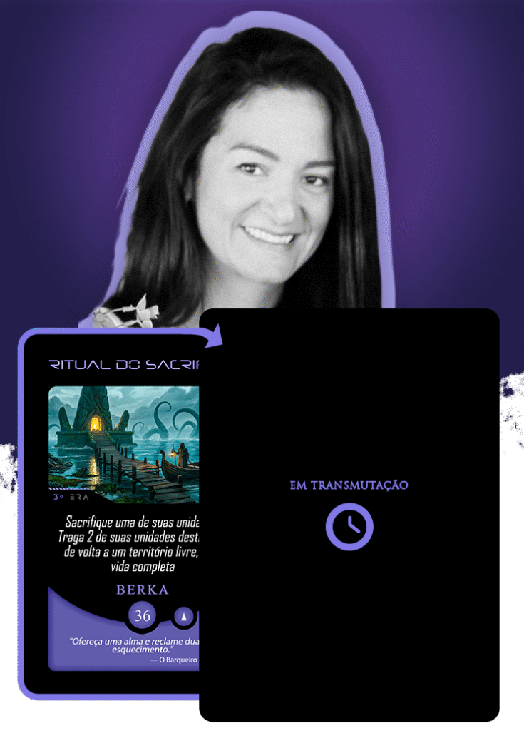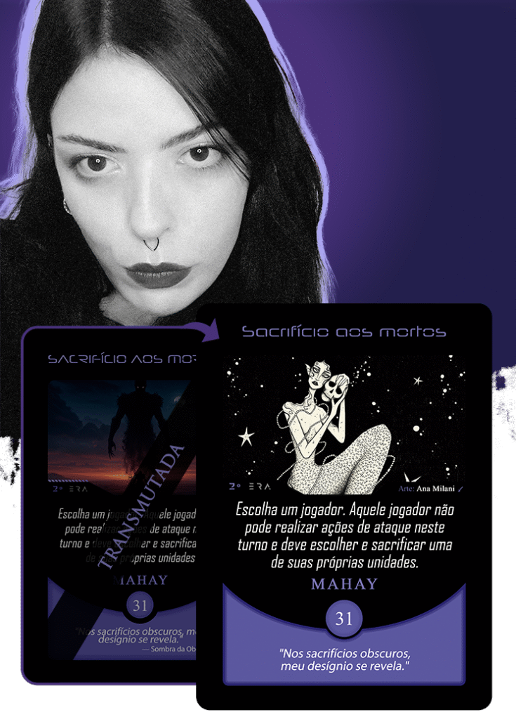 Ao entrar na Órbita Criativa do Planeta Insano, Ana direcionou sua maestria narrativa para transmutar a carta Sacrifício aos Mortos, guiada pelo eco letal do pensamento: “Nos sacrifícios obscuros, meu desígnio se revela.”