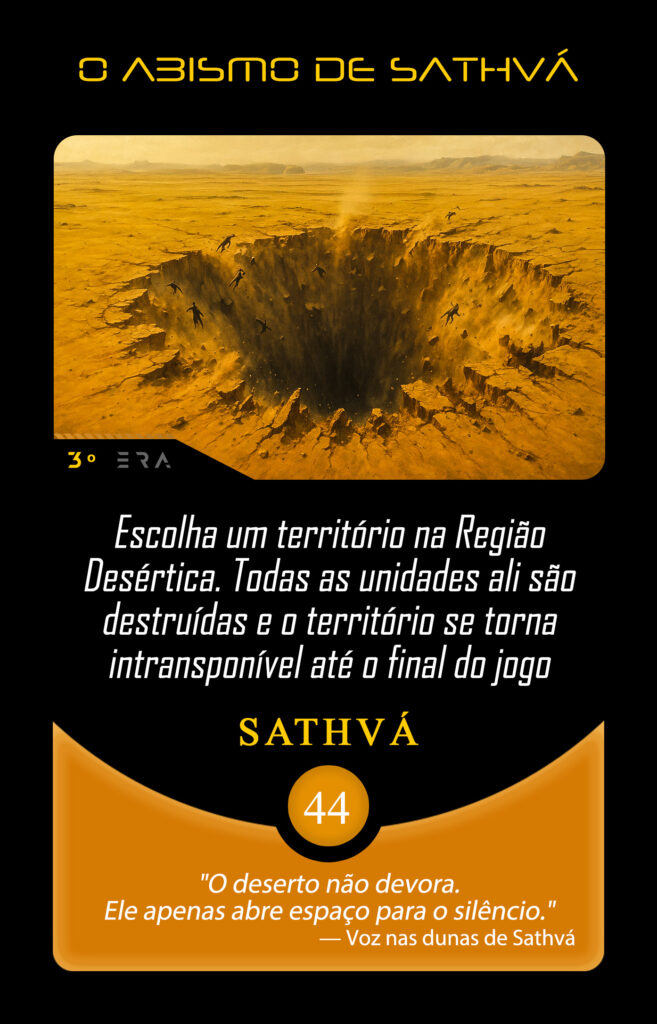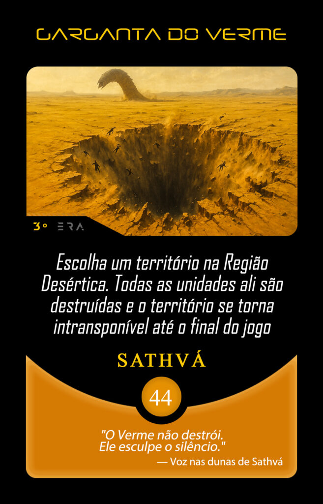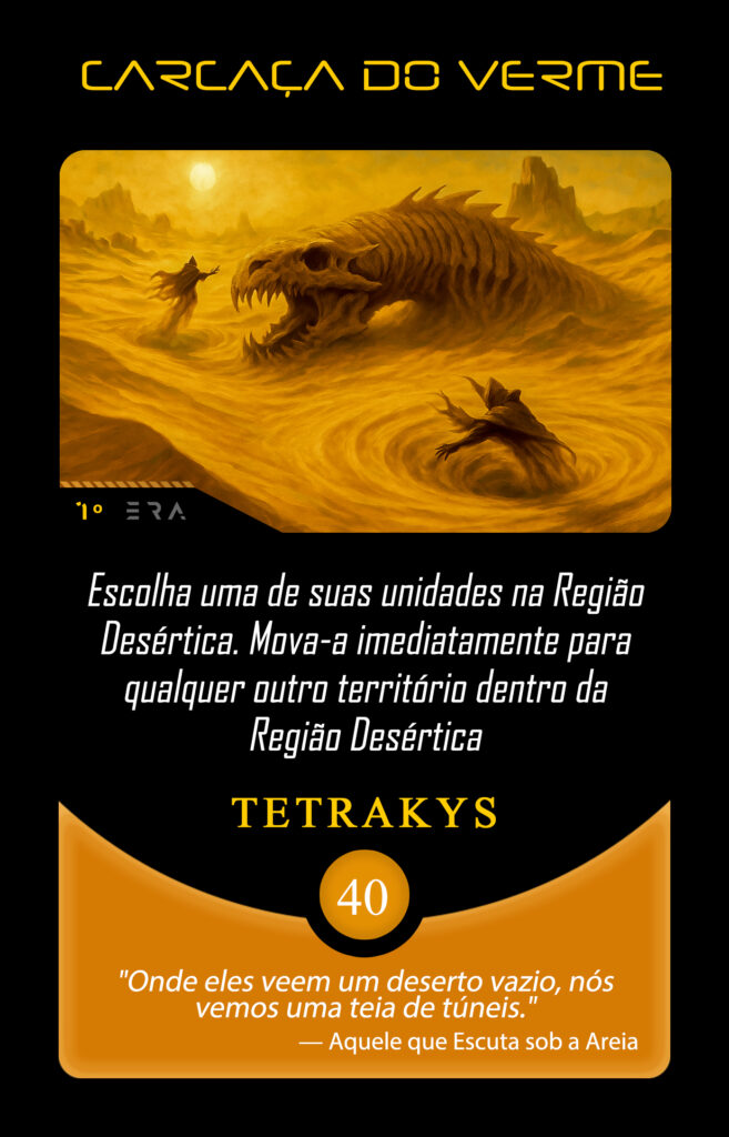 Nos desertos vastos e implacáveis, o silêncio é quebrado apenas pelo vento que redesenha as dunas. Ali caminha Zhaar’kûl, a Criatura Primordial, presença que antecede a memória e sobrevive ao tempo. Onde Zhaar’kûl desperta, as estruturas cedem. Não há escolha nem resistência. Há apenas revelação do que realmente sustenta a existência. O deserto testa tudo. Apenas o essencial permanece.