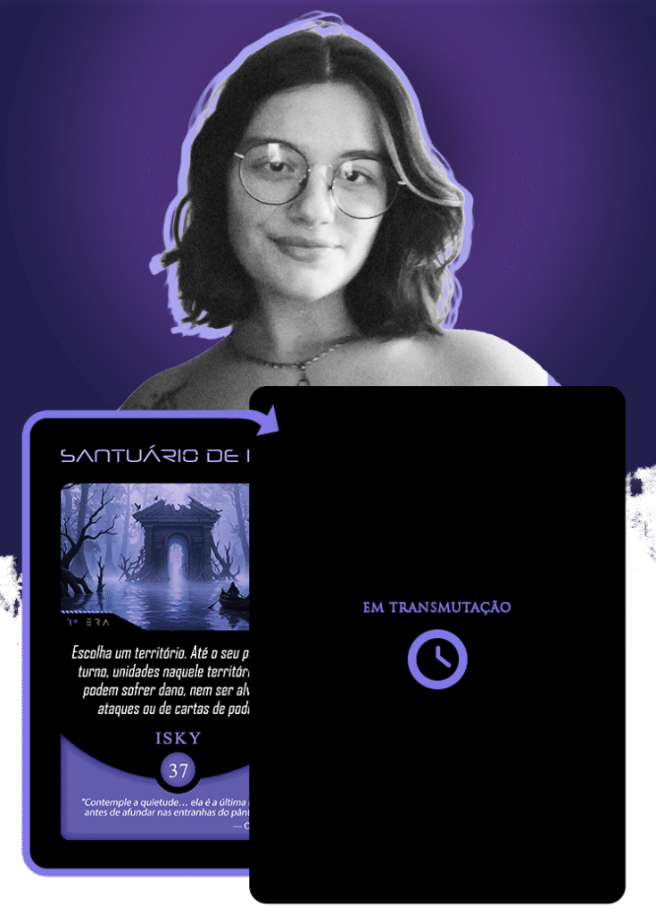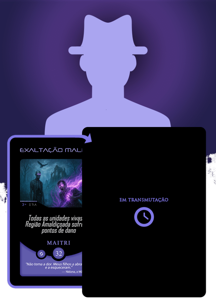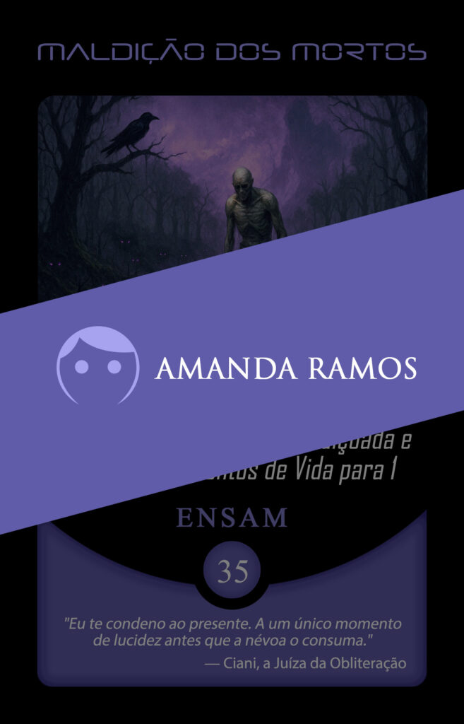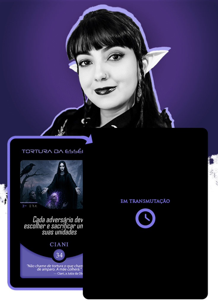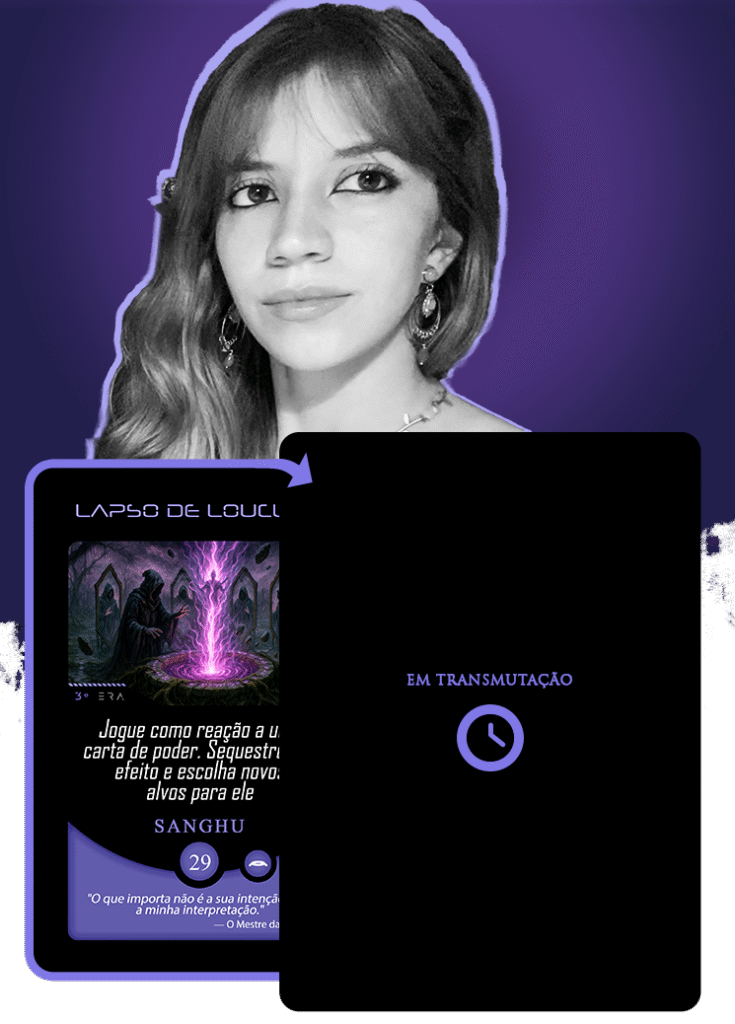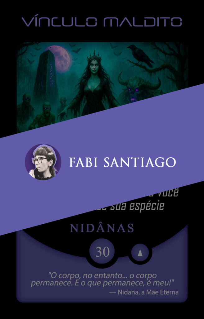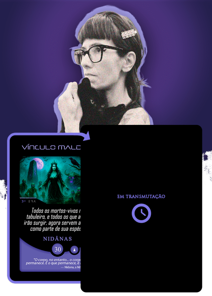 No universo do Planeta Insano, Fabi assume a transmutação da carta Vínculo Maldito, mergulhando na estética sombria da Região Roxa, onde vida e morte coexistem sob a névoa eterna de Nidana.