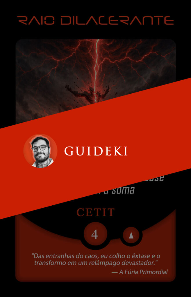 Ao assumir a transmutação da carta Raio Dilacerante, sua energia visual encontra o território da força primordial. O relâmpago deixa de ser apenas destruição e torna-se expressão de potência, transformação e presença.