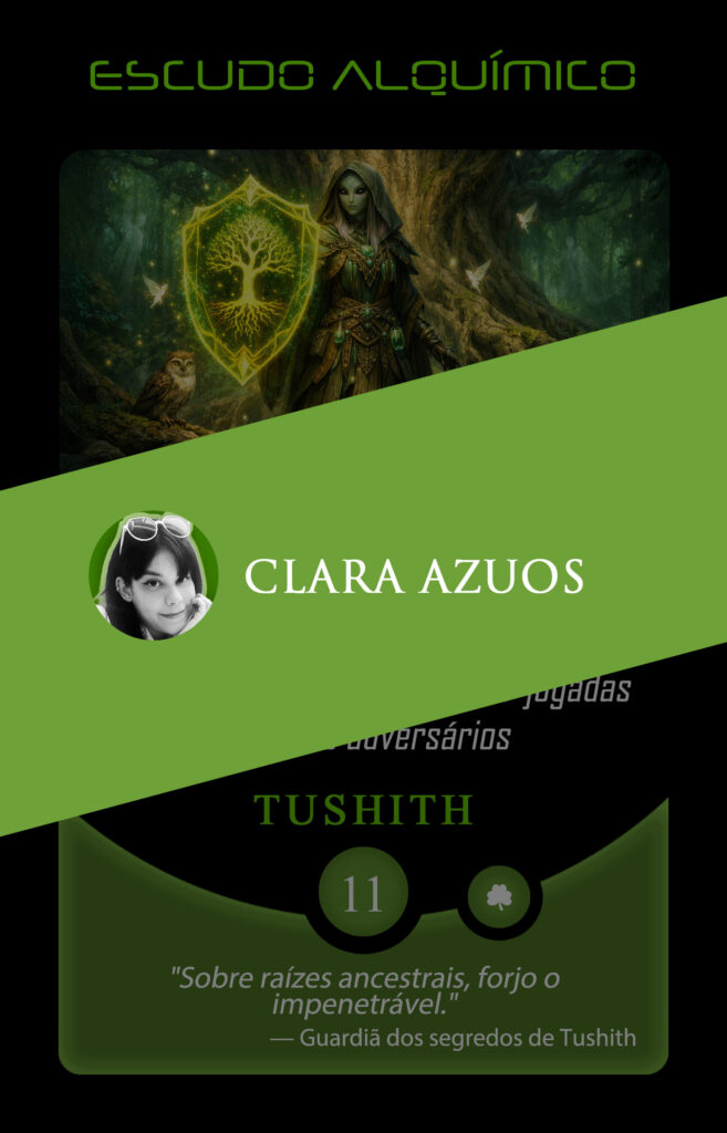 No universo do Planeta Insano, Azuos escolheu transmutar a carta Escudo Alquímico e forjar o impenetrável com símbolos de sua raiz ancestral.