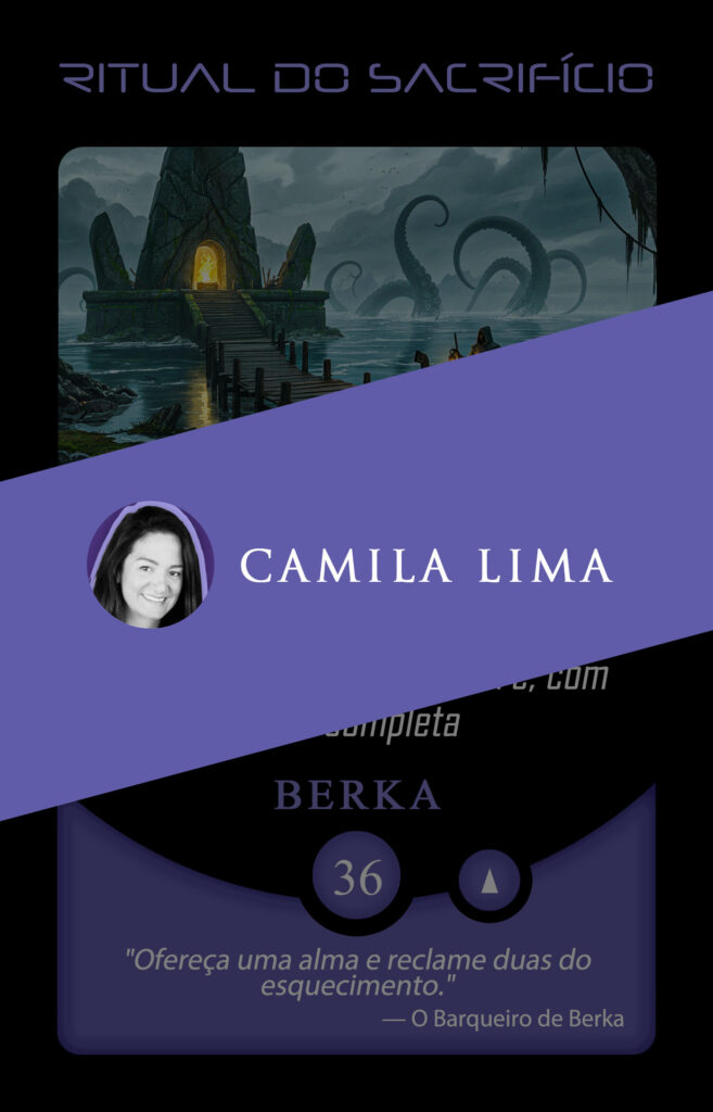 No Planeta Insano, Camila escolheu habitar o território roxo e reinterpretar a carta Ritual do Sacrifício. Não por acaso. A região de Berka, envolta por névoas e ciclos de transmutação, dialoga profundamente com sua poética: ali, nada se perde, tudo se transforma.