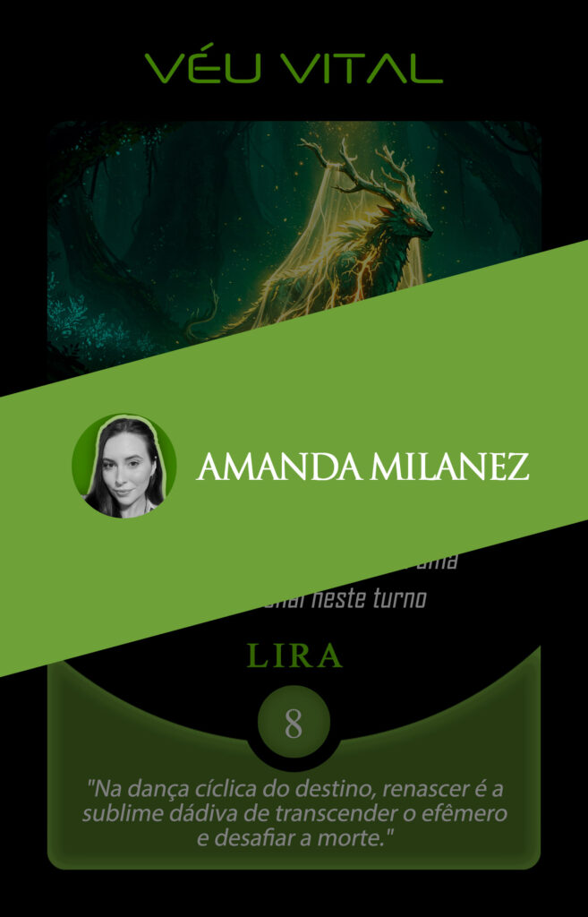 Na Órbita Criativa, Amanda assumiu a transmutação da carta Véu Vital, que carrega o pensamento: “Na dança cíclica do destino, renascer é a sublime dádiva de transcender o efêmero e desafiar a morte.”