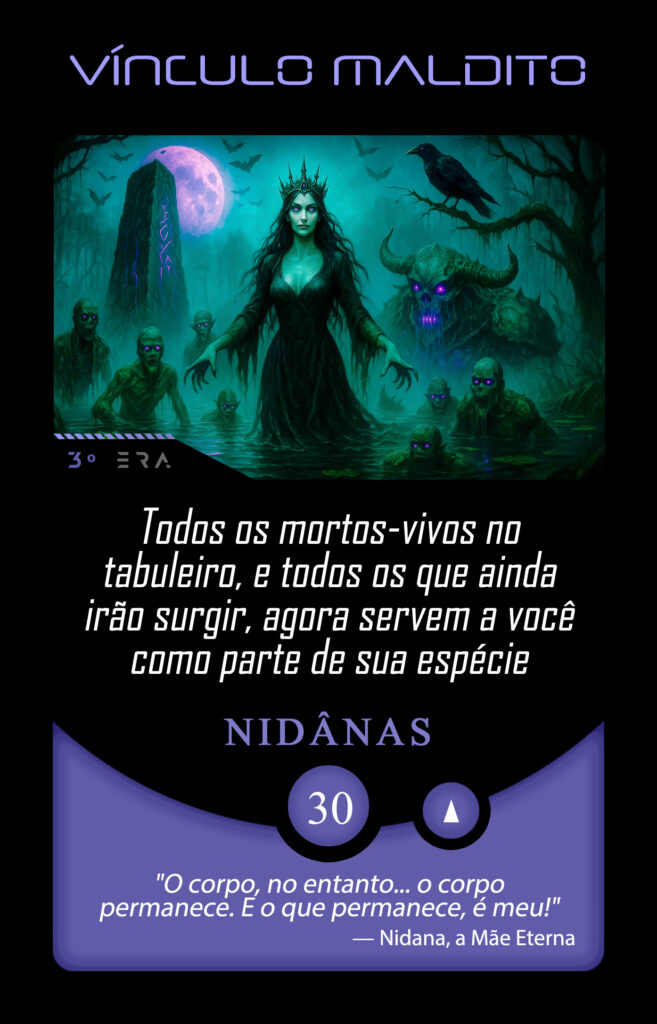 Os antigos murmuram o nome da entidade que ali reside: Nidana. Ela não reina… ela permeia. Não se senta em tronos, mas repousa sob as águas estagnadas, respira pela névoa, vê através do olhar de seus corvos de olhos púrpuras que cruzam os céus escuros, sempre vigiando.
